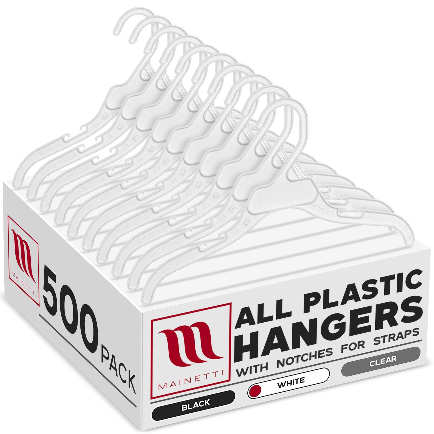 Mainetti 496, 12" White all Plastic, Shirt Top Dress Hangers, with notches for straps