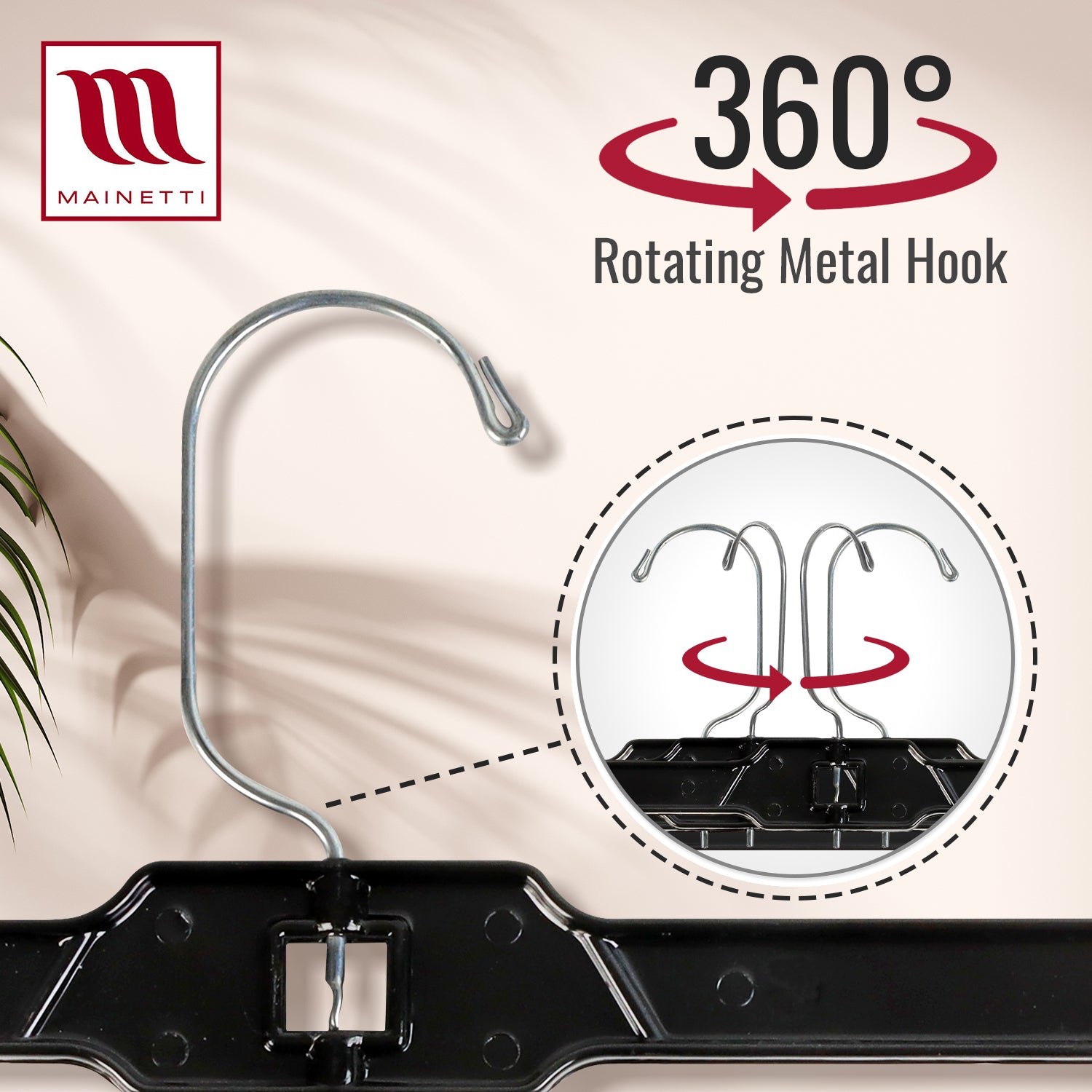 • The metal swivel hook is silver color and turns freely. Making it easy to hang garments on the rack or in your closet.